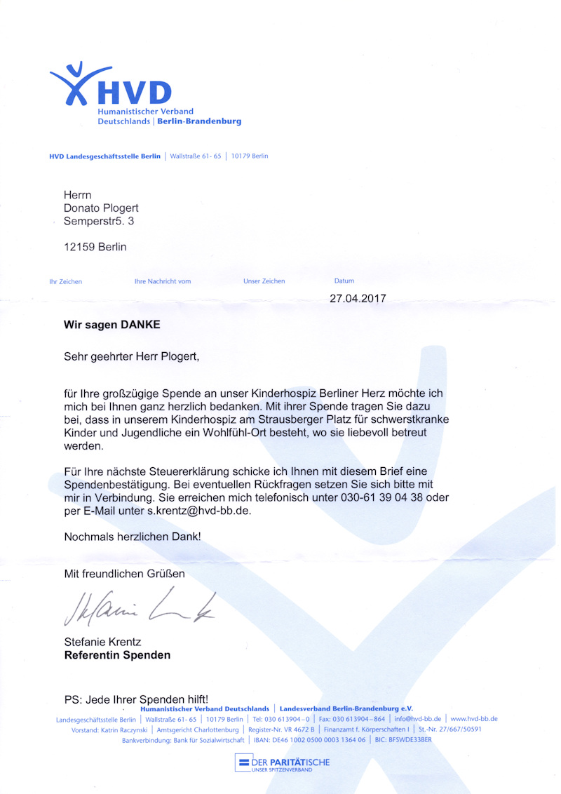 Dieses Dankes-Schreiben erhielt Donato nachdem er den Erlös aus dem CD-Verkauf übergeben hat.